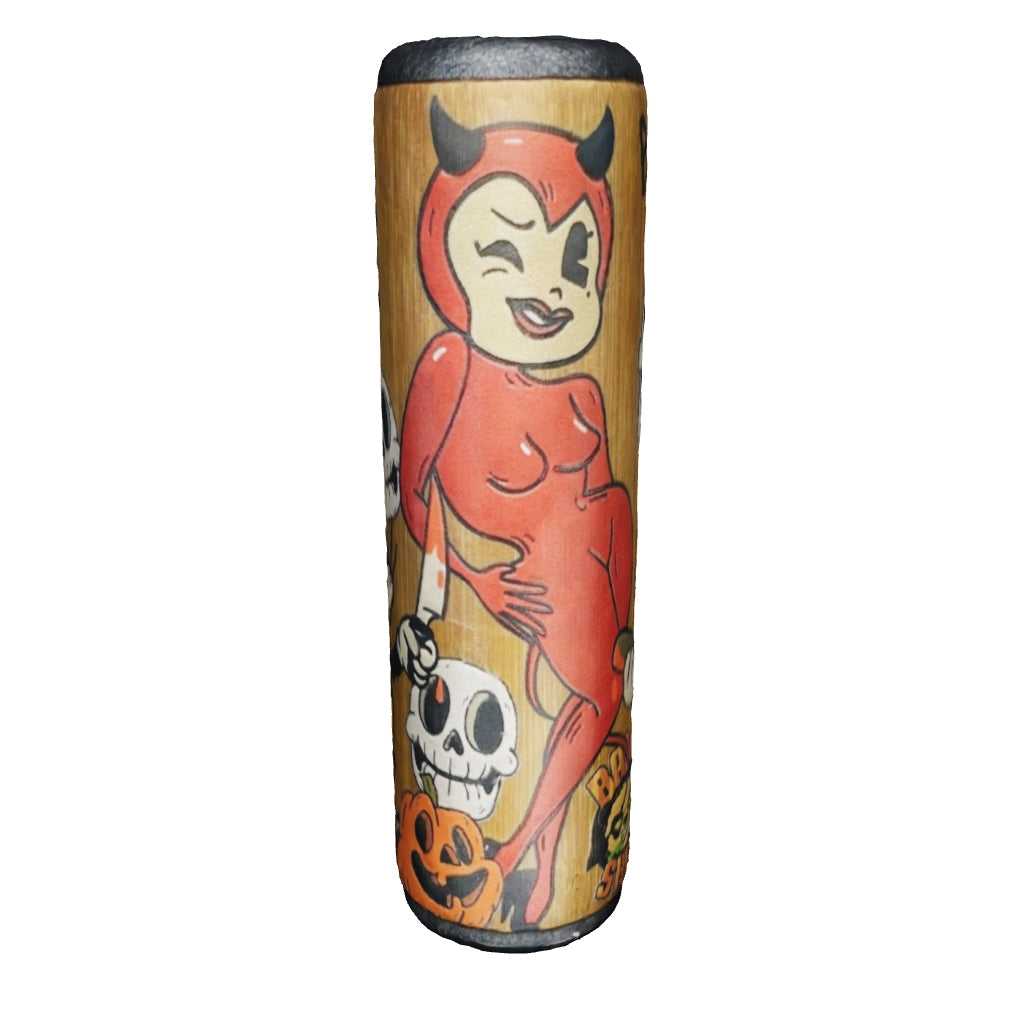 Inspired by classic mid-century Halloween art, this knob features a cheeky red devil surrounded by vintage-style skeletons and pumpkins — a perfect throwback to old-school cartoon mischief.
